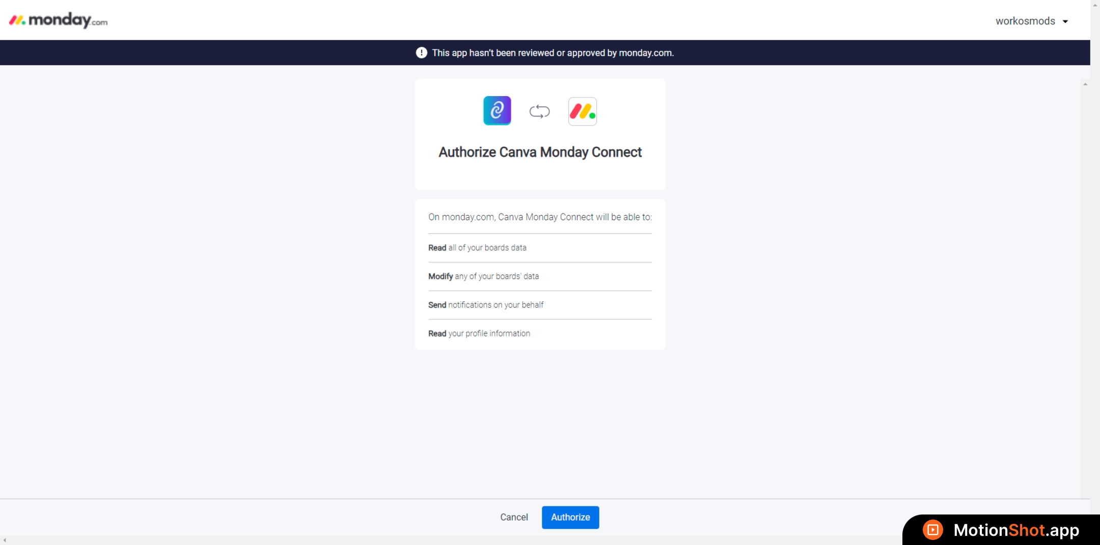 Click the 'Authorize' button to grant monday access